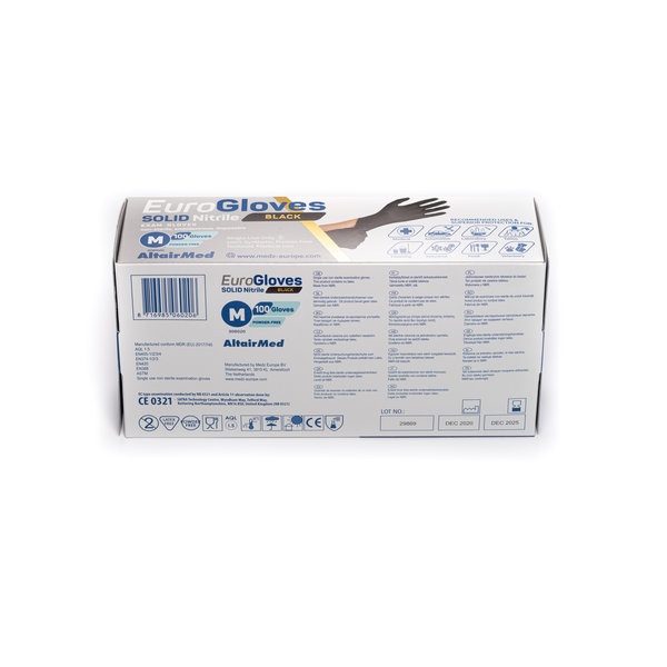 Eurogloves Solid Nitrile handschoenen in het zwart zijn ideaal voor mensen met een allergie of waar scheuren absoluut niet mag gebeuren. Deze extra sterke handschoenen voldoen aan de normeringen EN-455, EN-374 en EN-420. Bestel nu een doosje met 100 stuks.